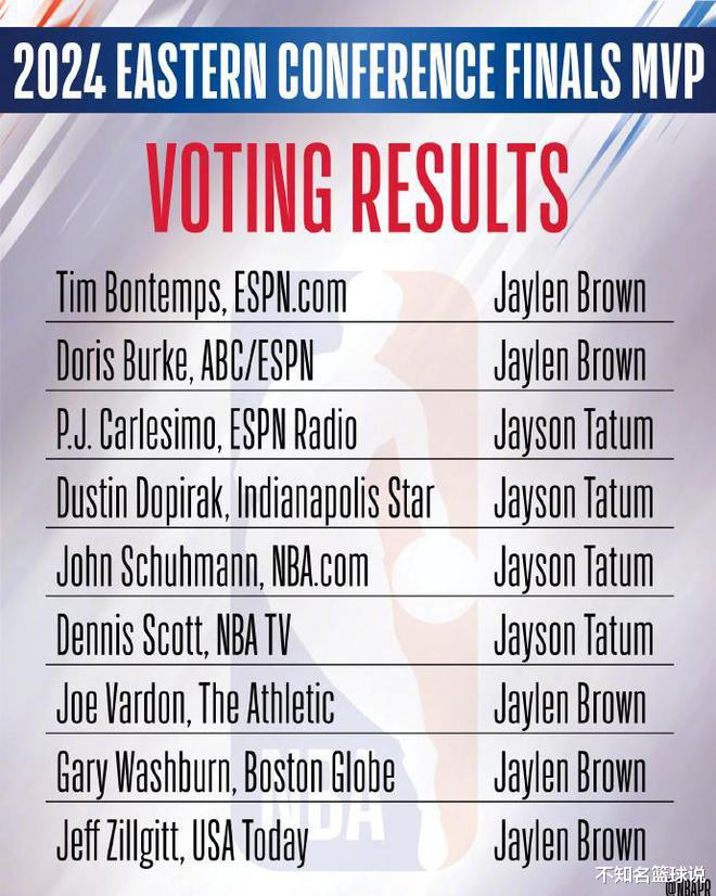 不过在东决系列赛,哪怕塔图姆哪怕场均得到30.3分10.3篮板6.3助攻,优于布朗场均贡献29.8分5篮板3助攻,但在东决MVP的评选当中,遗憾4-5以1票只差,依然是输给布朗无缘获奖。