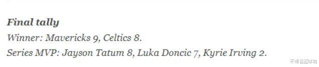 只是留给凯尔特人成功夺冠,总决赛MVP的归属会有悬念吗?在此前ESPN专家团预测FMVP时,17位专家投票,塔图姆获得8票高居第一,东契奇获得7票与欧文2票,其余凯尔特人球员没有获得任何一票。