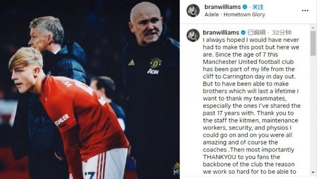 布兰登-威廉姆斯:我一直希望我永远都不用写这篇文章,但现在我不得不写了。从7岁开始来到卡灵顿,曼联日复一日地成为我生活的一部分。为了终生难忘的兄弟情谊,我要感谢我的队友们,尤其是过去17年里与我共事的队友们。感谢工作人员,包括装备师、维修工、保安和理疗师,我可以一直说下去,你们都很出色,当然还有教练们。最重要的是,感谢球迷们,你们是俱乐部的中流砥柱,是我们如此努力工作的原因,因为你们配得上最高水平的表现。结束了!一日红魔,终生红魔!