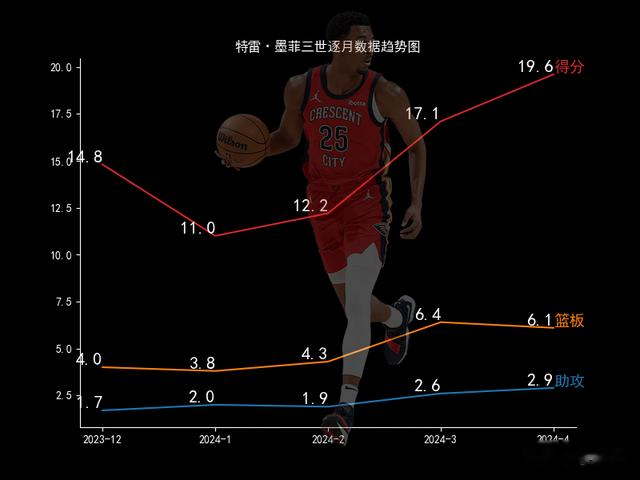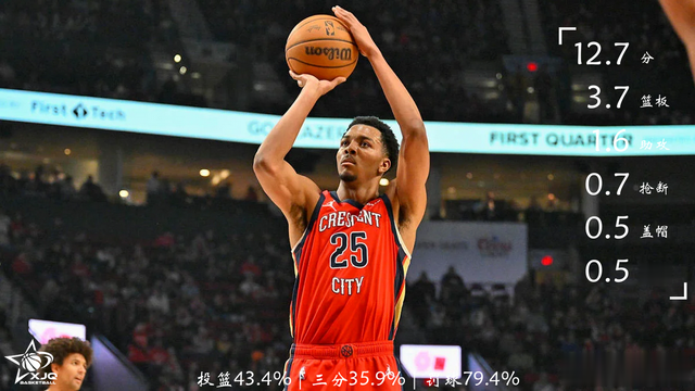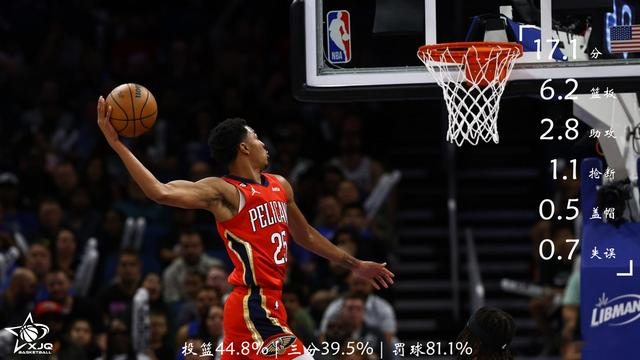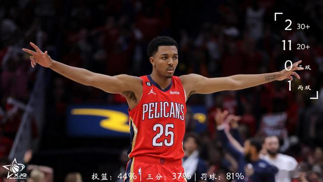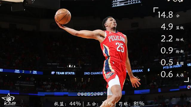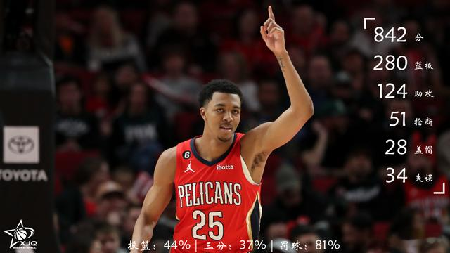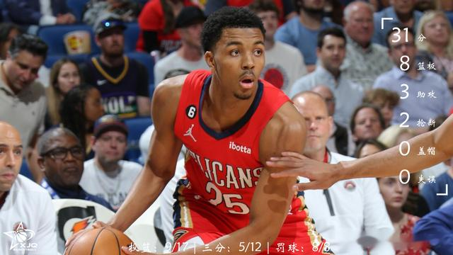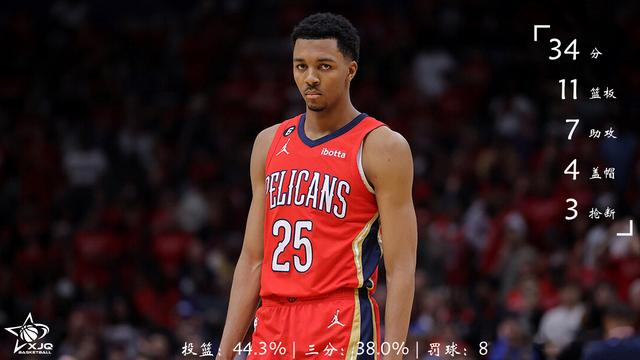得分纪录:34,2024-03-05鹈鹕战胜猛龙,全场贡献34分6篮板。