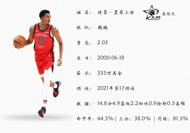 特雷·墨菲三世,2021年灰熊选中的第17顺位新秀,出生于2000-06-18,身高2.03m,体重93.4kg,司职前锋,现效力于鹈鹕,本赛季是他职业生涯的第3个赛季,薪金为335万美金。
